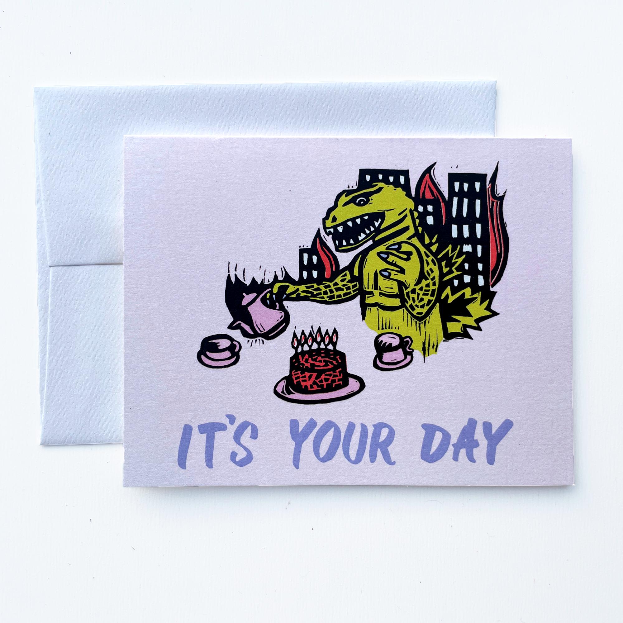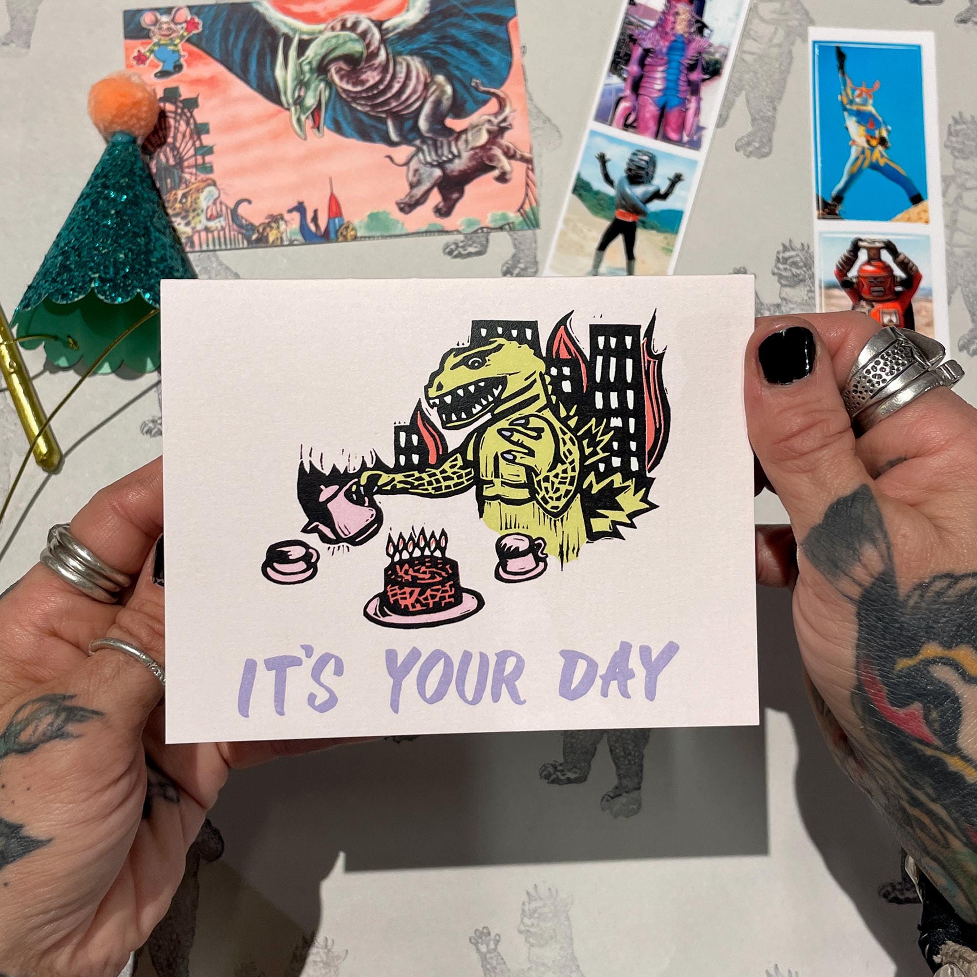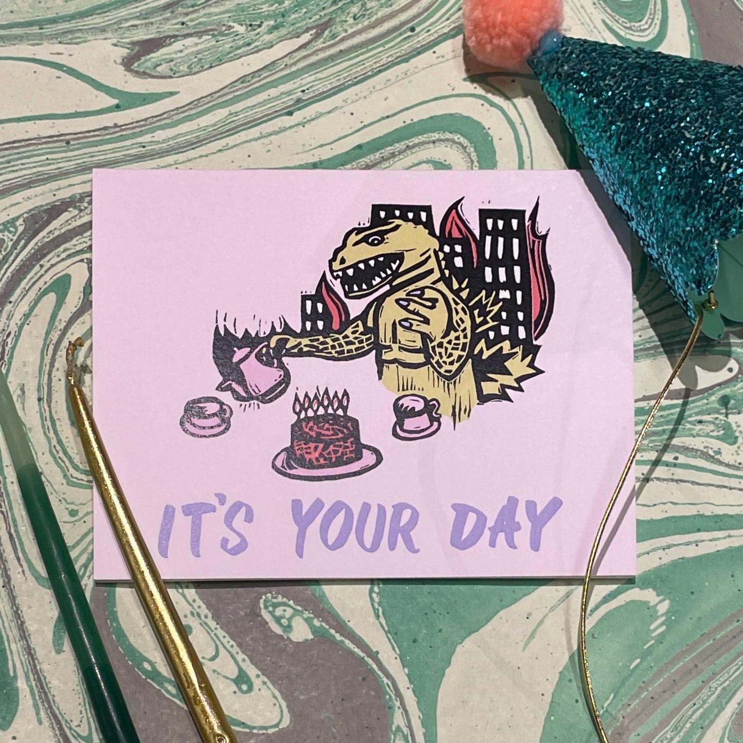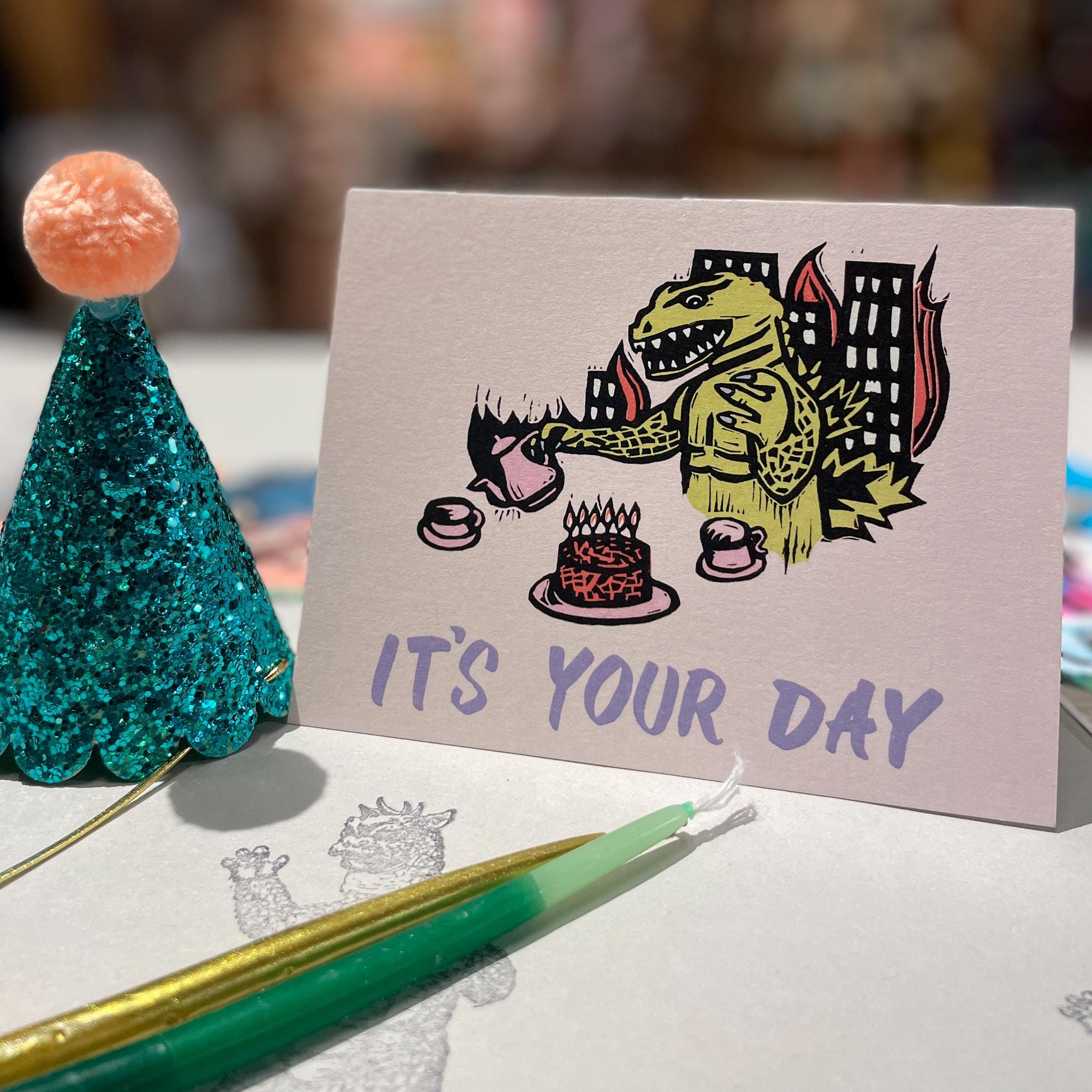 This is a reproduction of a linocut print. This card is printed by a family owned local shop, so you are supporting two small businesses with your purchase.