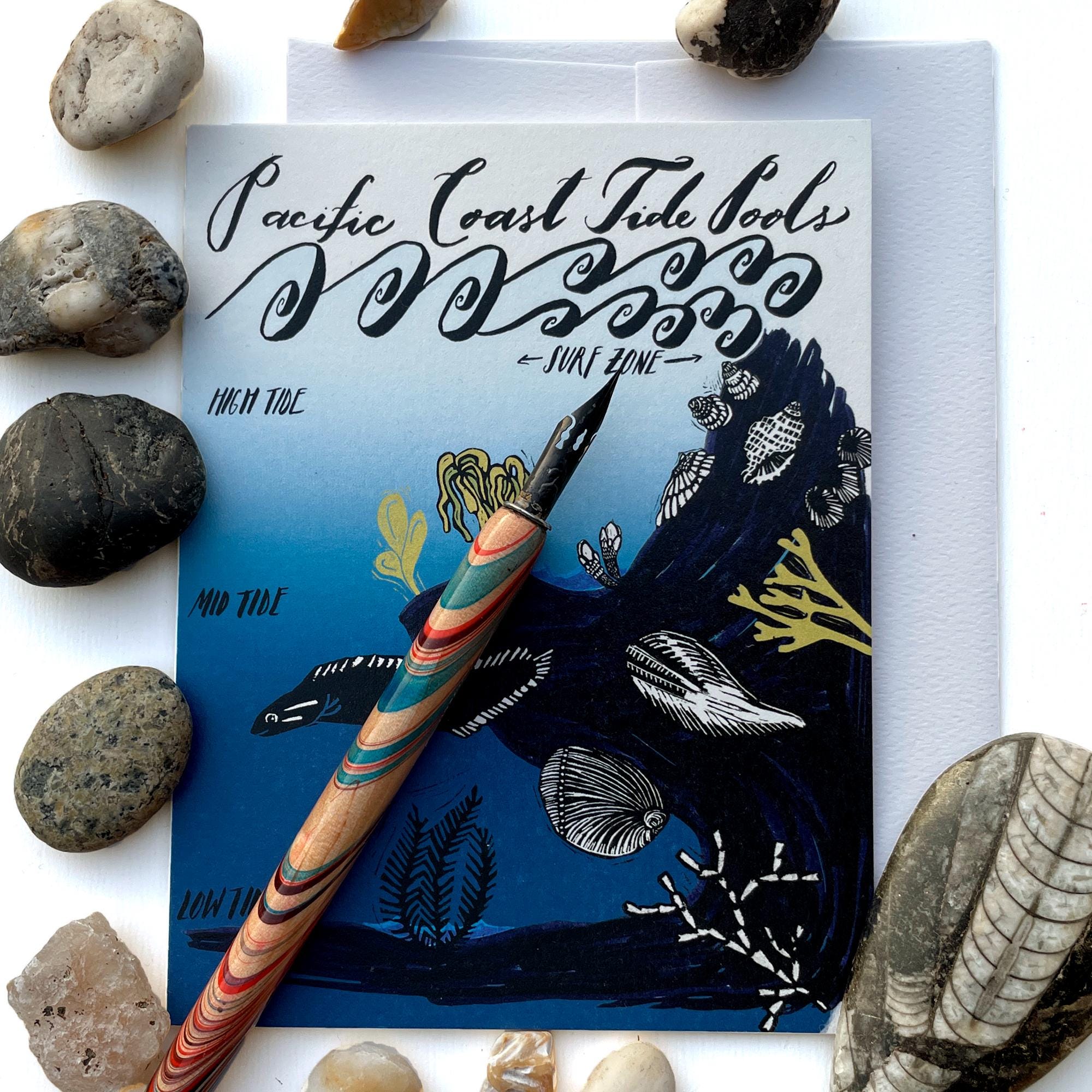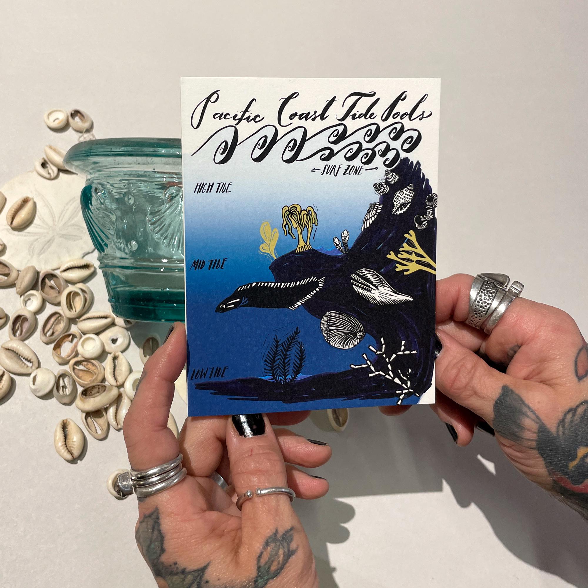 This is a blank greeting card of my illustrated guide to some of the creatures found in tide pools. Images are original illustrations carved from linoleum and digitally reproduced. I use a local printing company, so you are supporting two small businesses with this purchase!